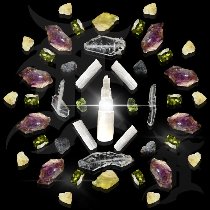 ABUNDANCE CRYSTAL GRID SCREEN SAVER: SELENITE, MOLDAVITE, TEKTITE, FADEN QUARTZ, LIBYAN DESERT GLASS, PERIDOT, SUPER SEVEN AMETHYST.